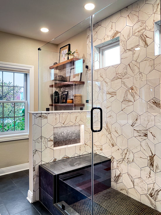 The oversize walk-in shower exudes visual splendor with stunning hexagonal tiles and a clear glass surround, opening up the room while maintaining elegance. A practical built-in bench within the shower offers comfort and utility, enhancing the showering experience. An inset niche adorned with hexagonal tiles mirrors the shower tile, creating a seamless and unified design aesthetic. Transom windows installed in the shower ingeniously bring in natural light, adding an airy and inviting feel to the space.