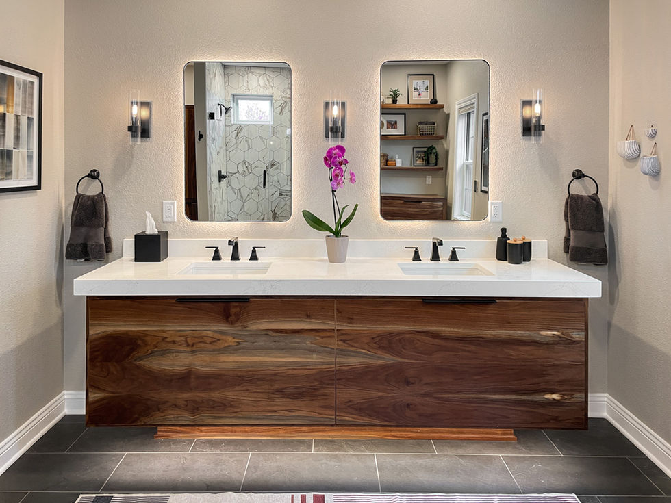The chunky white quartz counters, sleekly cut with clean edges, stand in bold contrast against simple dark-colored faucets, creating an aesthetic balance that oozes refinement. Two simple mirrors with thin frames and rounded edges, subtly backlit for added ambiance, grace the wall above the double-sink vanity, enhancing the room's allure.