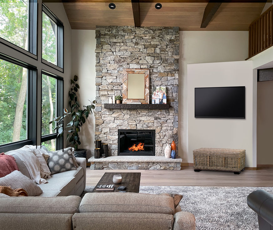 A centerpiece of this renovation is the floor-to-ceiling natural stone fireplace, seamlessly complemented by expansive full wall windows that invite the outdoors in, bathing the room in natural light. This captivating focal point establishes a connection between the interior and the natural world outside. Bringing the essence of the beautiful surroundings indoors, indoor plants breathe life into the space, infusing freshness and a natural ambiance. Natural textures, incorporated into practical elements like a storage ottoman, further accentuate the room's connection to the outdoors.